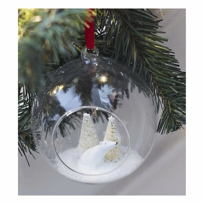 The round bauble features a circular hole at the front, making it easy to fill your stunning decoration with anything you like, from Christmas characters to snowy scenes. The bottom of your bauble is flat, allowing you to choose between hanging your glass decoration from the included jute string or simply placing it flat to decorate mantelpieces or windowsills.