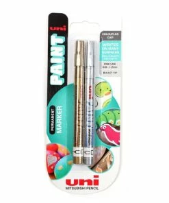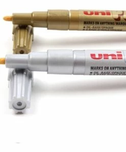 TheΒ Uni Paint Silver and Gold Bullet Tip Permanent MarkersΒ are the perfect pens for writing on almost any surface, including timber, glass, stone, metal and plastic. They will apply permanent ink, with a tip size of 0.8 to 1.2 mm.